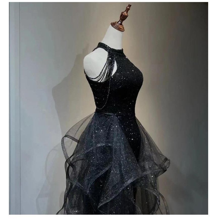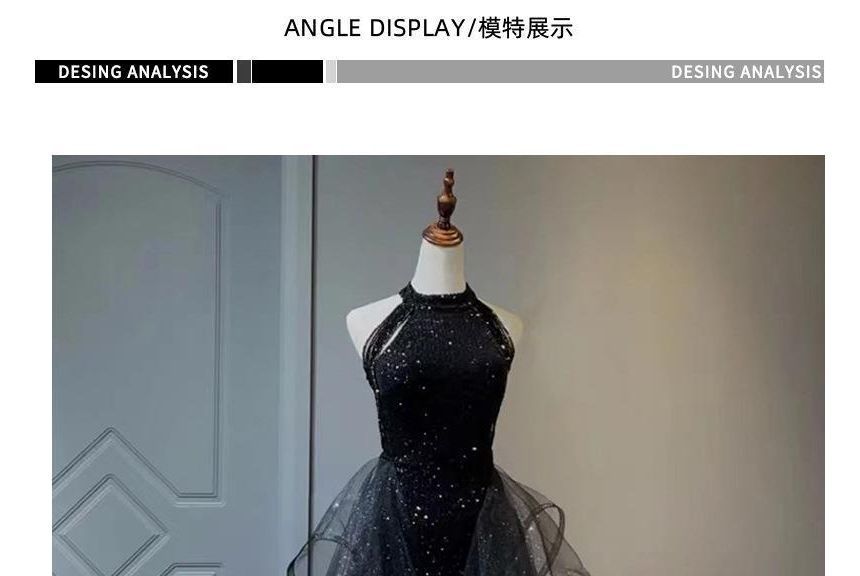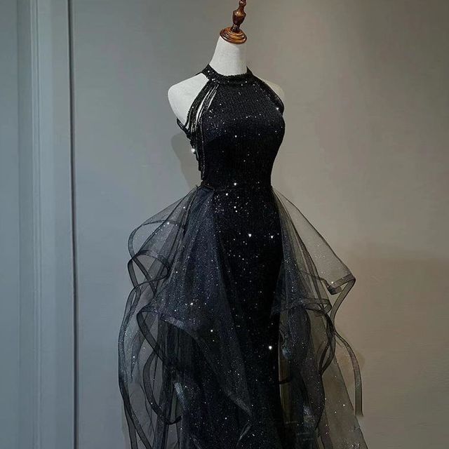 Sleeveless Crew Neck Plain Glitter Beaded Ruffle Panel Mesh A-Line Evening Gown
