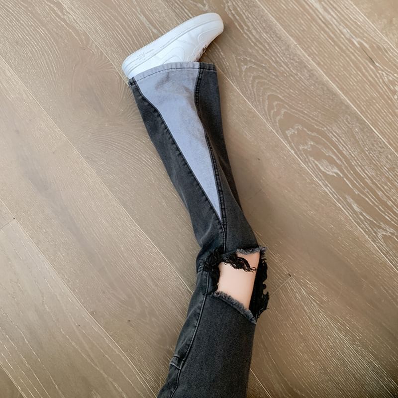 High Waist Washed Panel Distressed Flared Jeans