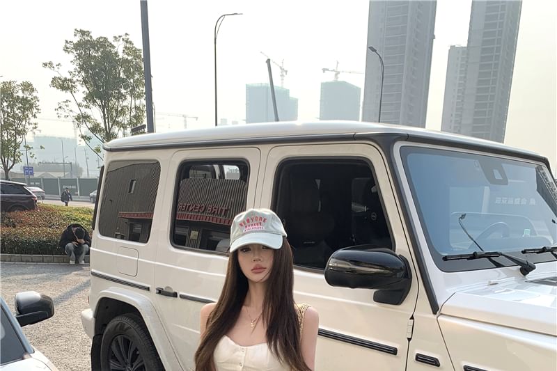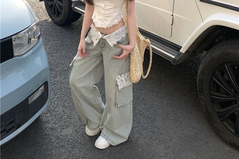 Plain Button Panel Lace Cami Top / Mid Waist Washed Panel Lace Wide Leg Cargo Jeans