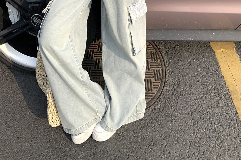Plain Lace Jeans Button / Mid Washed Wide Top Leg Cami Waist Cargo Panel