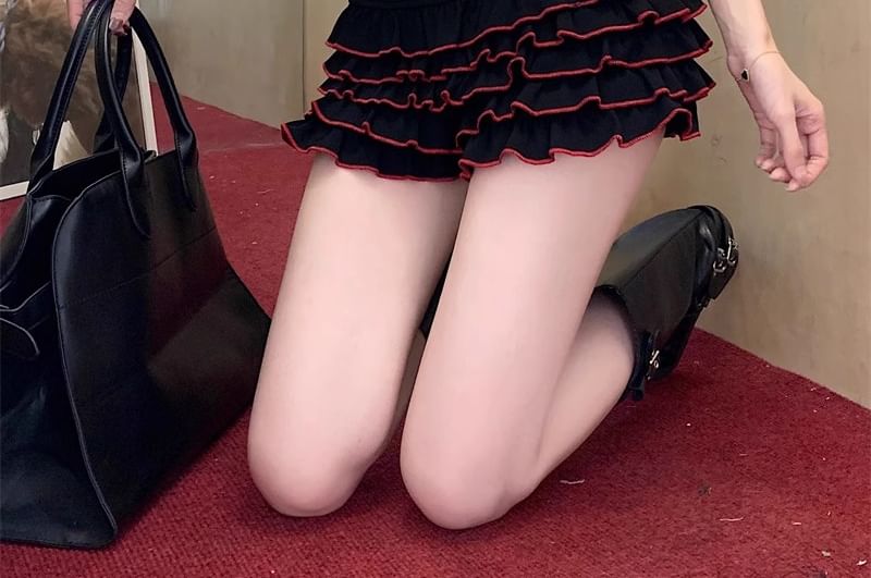Tee Off-Shoulder Waist Dotted Slim Skort Fit Tiered High / Cap-Sleeve Lettering