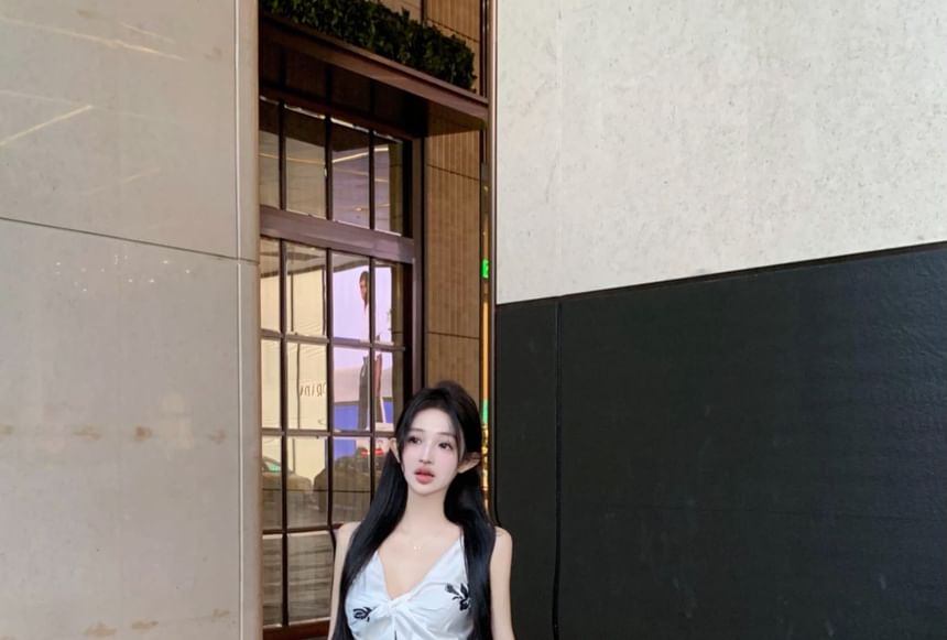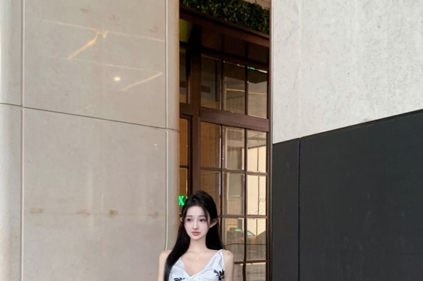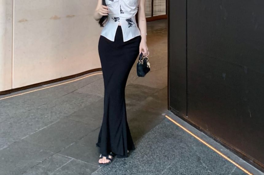 Top Pencil Slit Skirt High Print / Rise Plain V-Neck Floral Maxi Cami