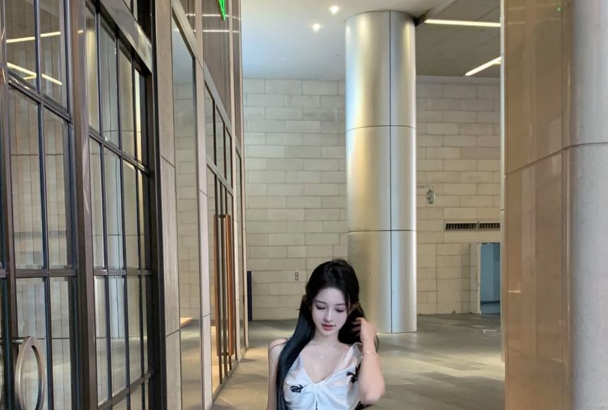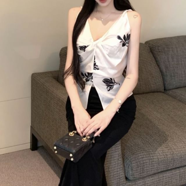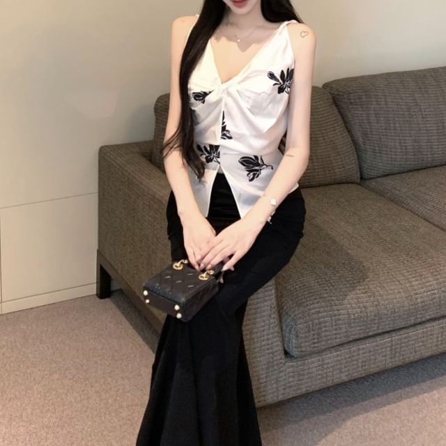 V-Neck Floral Print Slit Cami Top / High Rise Plain Maxi Pencil Skirt