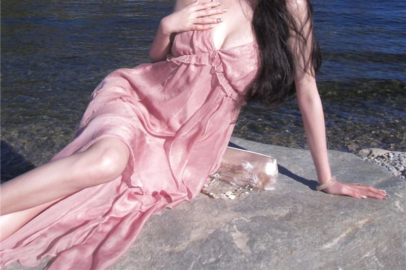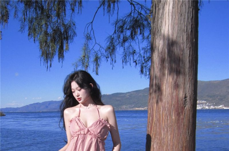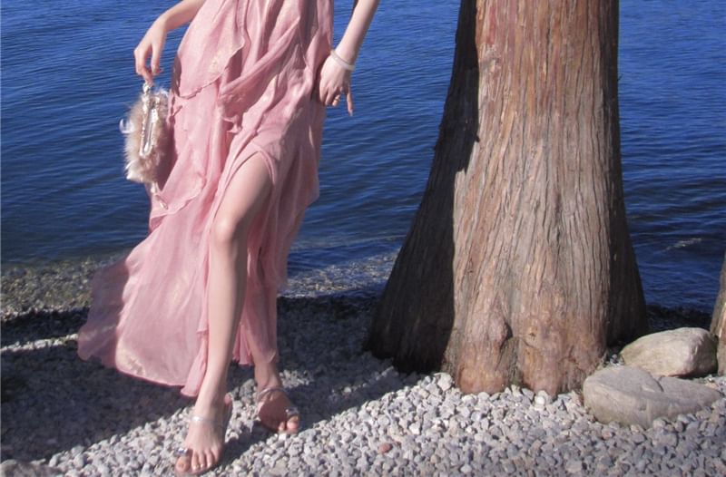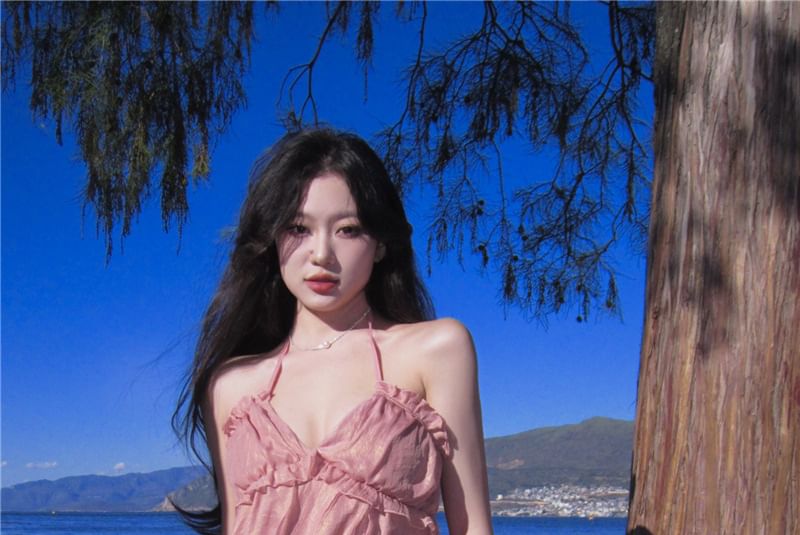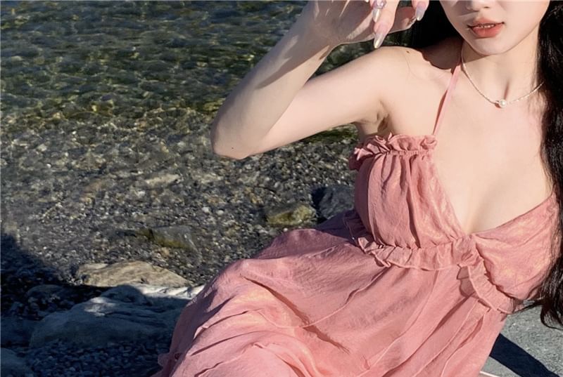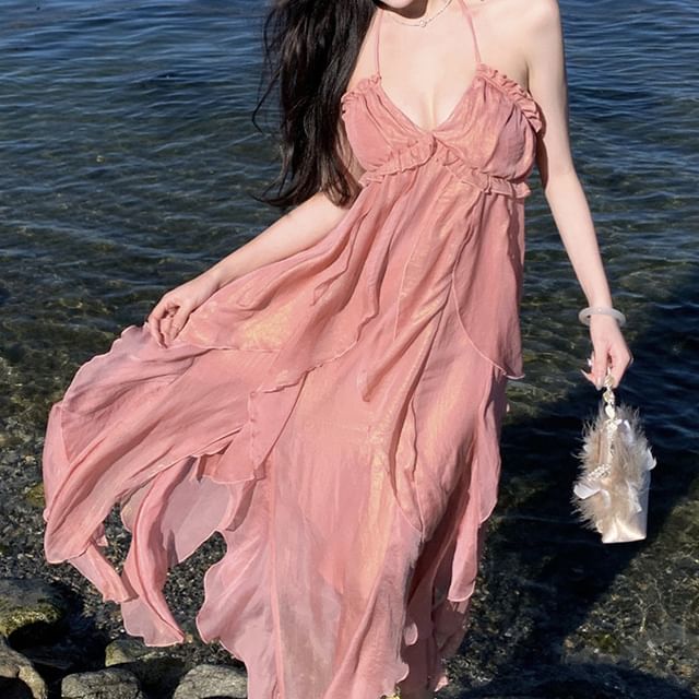 Halter V-Neck Plain Ruffle Trim Maxi A-Line Dress