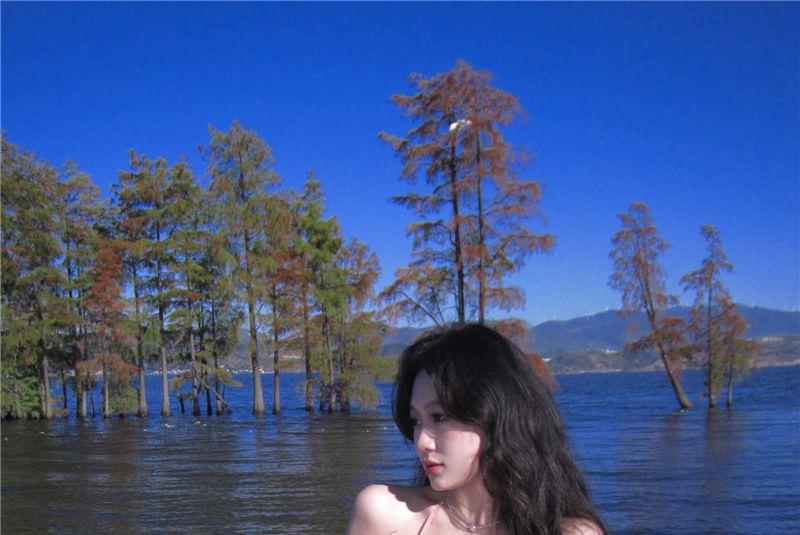 A-Line Maxi Halter Trim Dress Ruffle V-Neck Plain