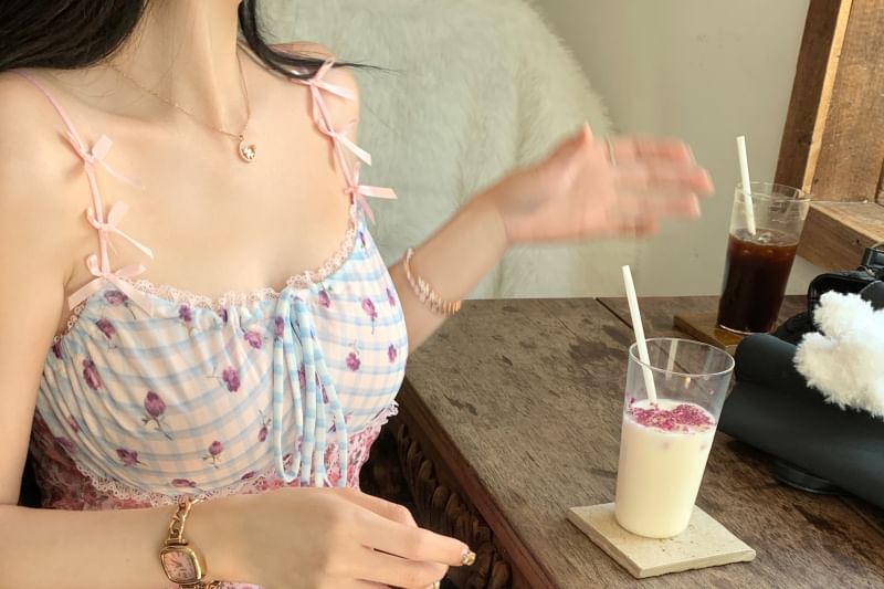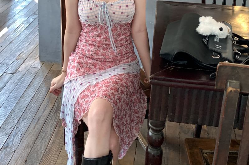 Spaghetti Strap Floral Print Panel Asymmetrical Mini Bodycon Dress