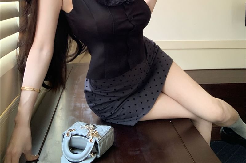 Sleeveless Square Neck Frill Trim Plain Top / Dotted Mini Skirt
