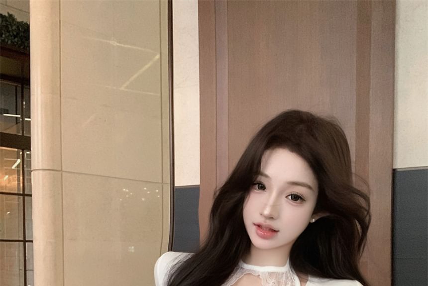 Long Sleeve Round Henley Neck Plain Lace Panel T-Shirt