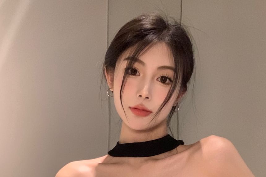 Neck Off Slim Top Crop Short-Sleeve Fit Plain Halter Shoulder