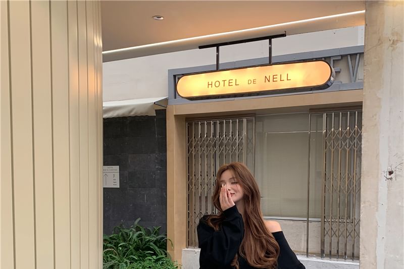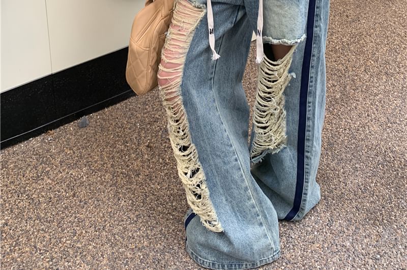 Off-Shoulder Plain Pullover / Drawstring Waist Contrast Trim Washed Ripped Wide Leg Jeans
