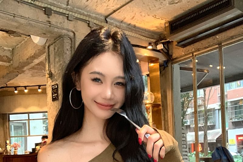 Long-Sleeve Asymmetrical Neck One-Shoulder Plain Crop Slim Fit T-Shirt