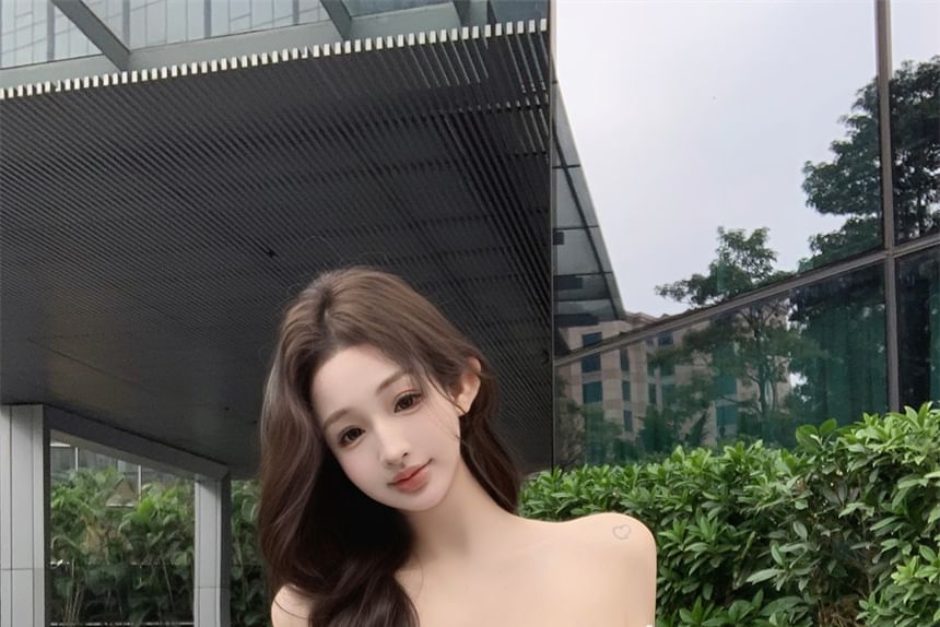 Off-Shoulder Plain Bow Accent Ruffle Hem Crop T-Shirt