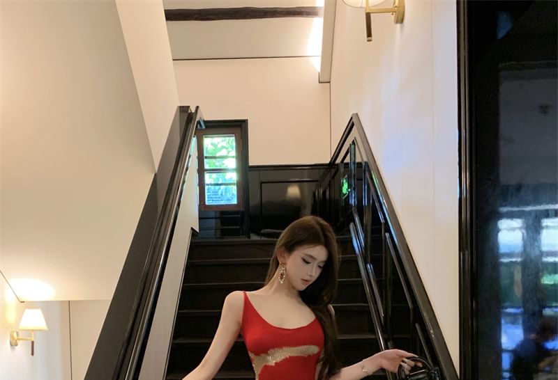 Scoop Patterned Sleeveless Neck Dress Back Maxi Open Bodycon