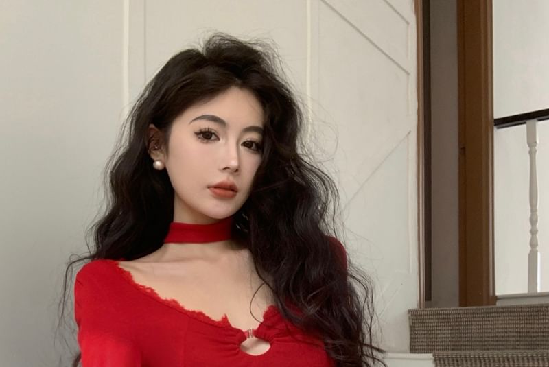Long-Sleeve Scoop Neck Plain Lace Trim Cropped T-Shirt