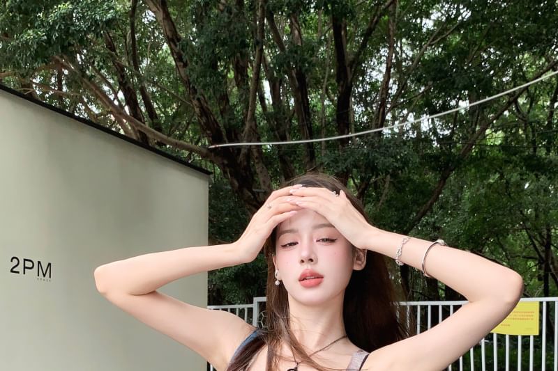 Square Neck Denim Print Asymmetrical Sheer Tank Top / Plain Bra Top