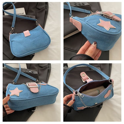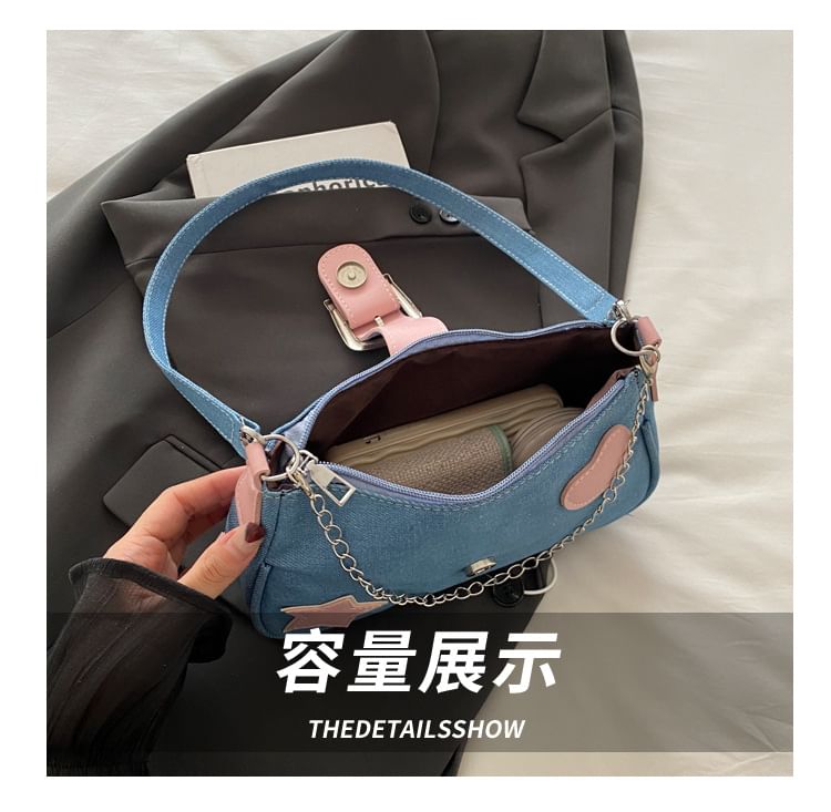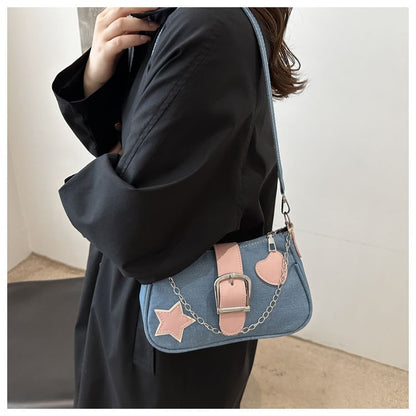 Applique Chained Buckled Denim Crossbody Bag
