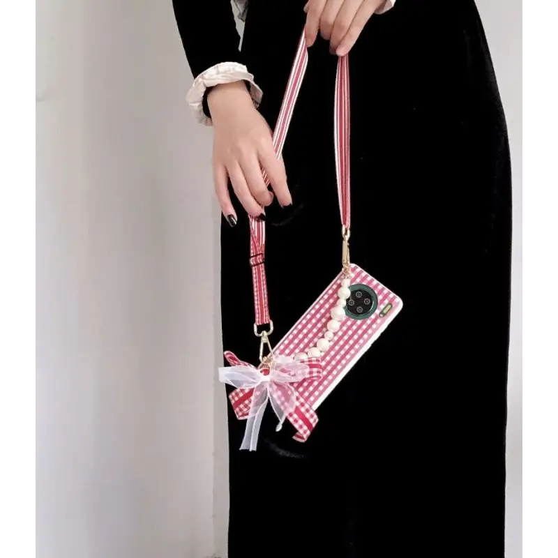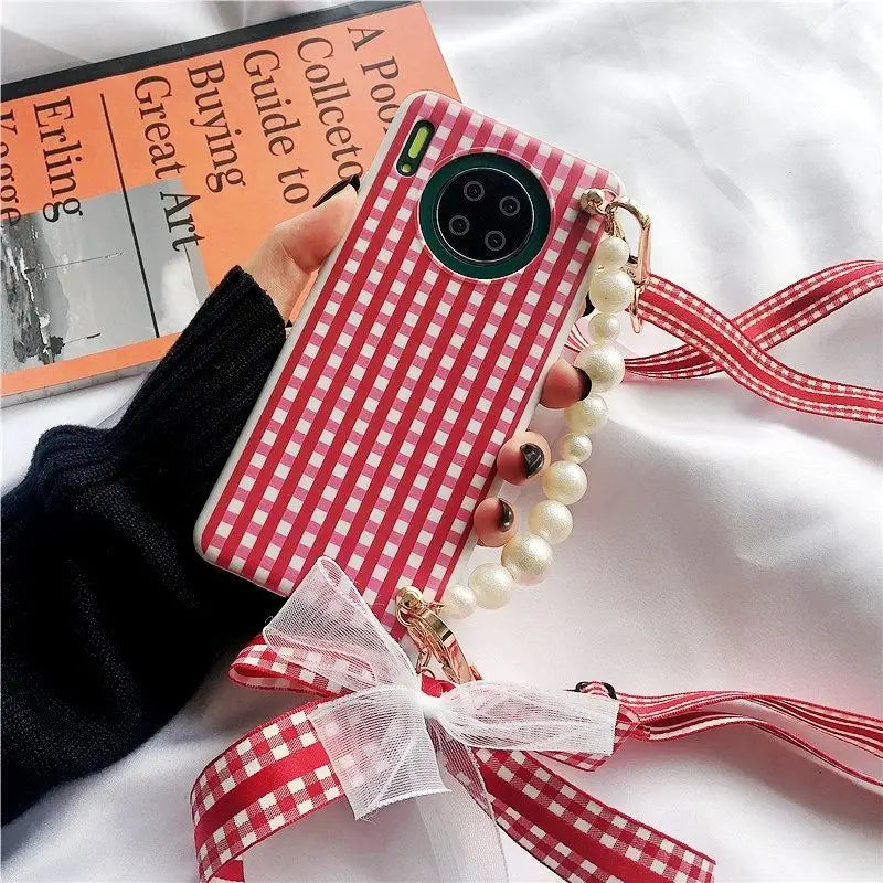 Faux Pearl Hand Strap Plaid Phone Case - Samsung