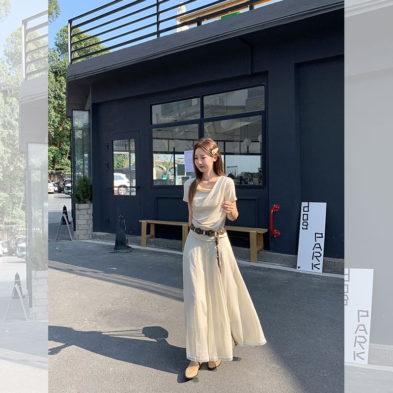 Cowl Plain Neck Slim Fit Ruched T-Shirt Short-Sleeve