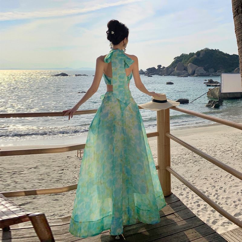 Crop Set: Floral Sleeveless Maxi + Top High Rise A-Line Skirt