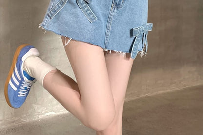 High Waist Washed Bow Fray Mini A-Line Denim Shorts
