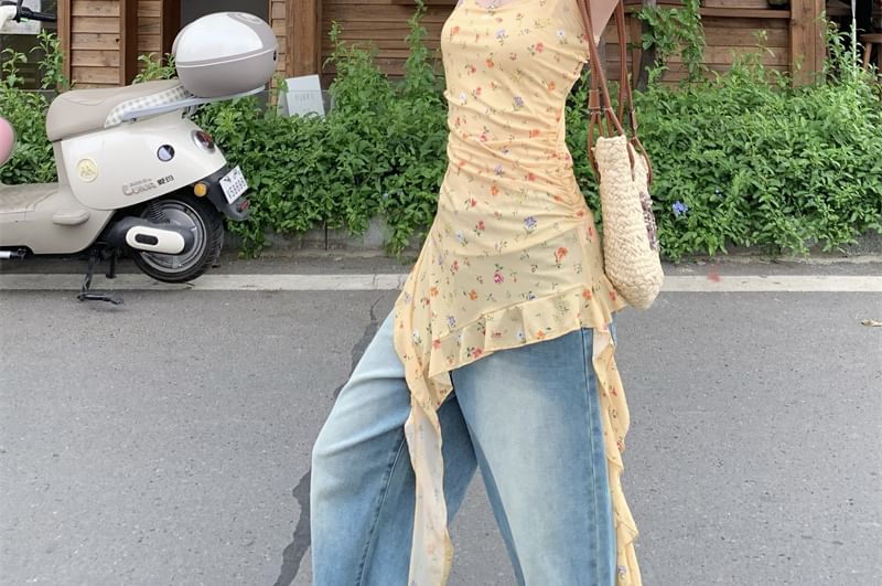 Floral Asymmetrical Neck Trim Tank Ruffle Fit Square Top Slim