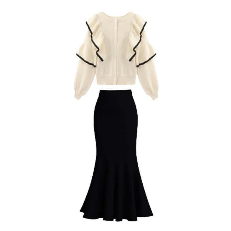 Flouncing Knit Cardigan Sweater Fishtail Skirt