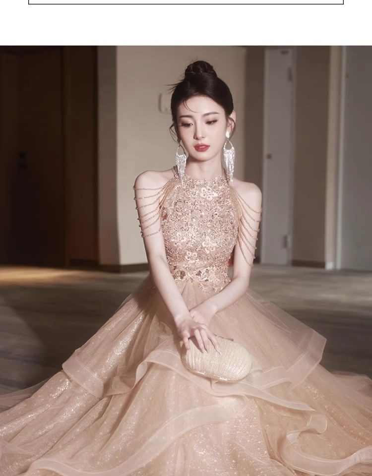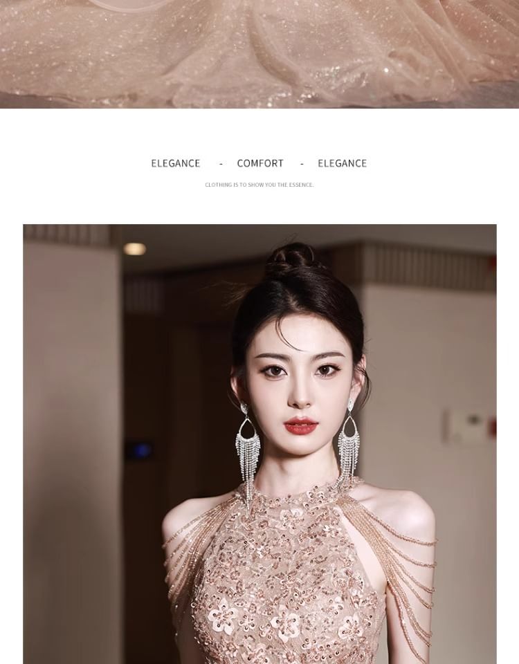 Halter Neck Floral Sequin Fringed Layered A-Line Evening Gown