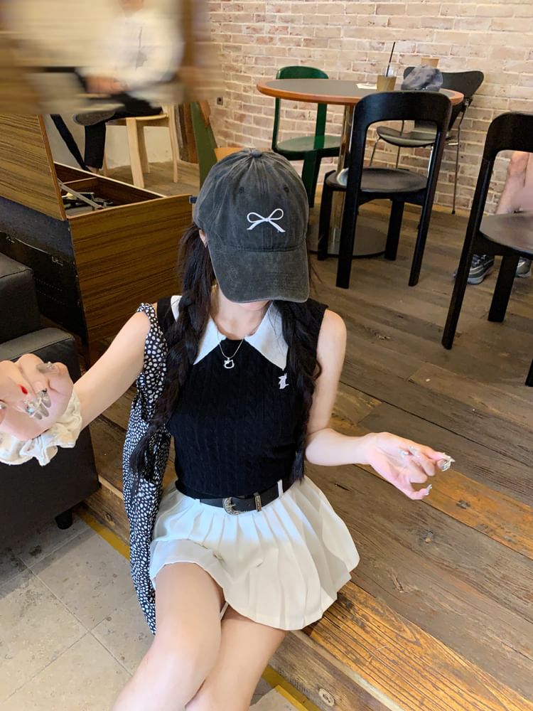 Contrast Collar Knit Tank Top / High Waist Plain Pleated Mini A-Line Skirt