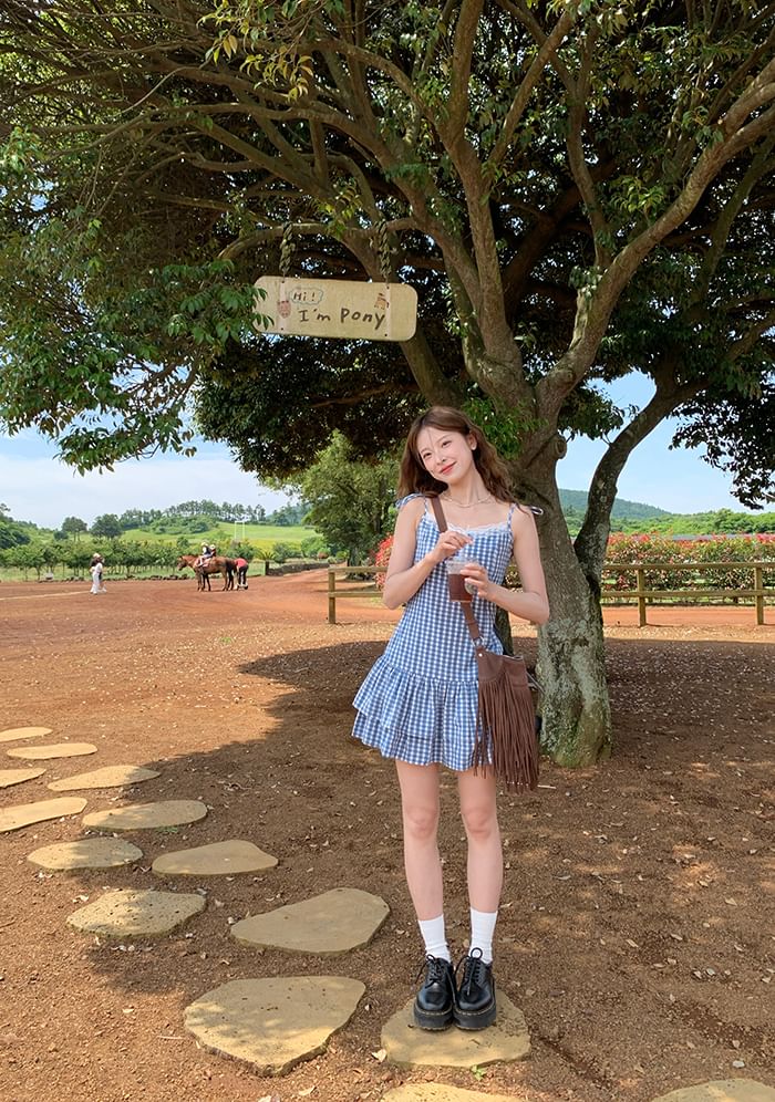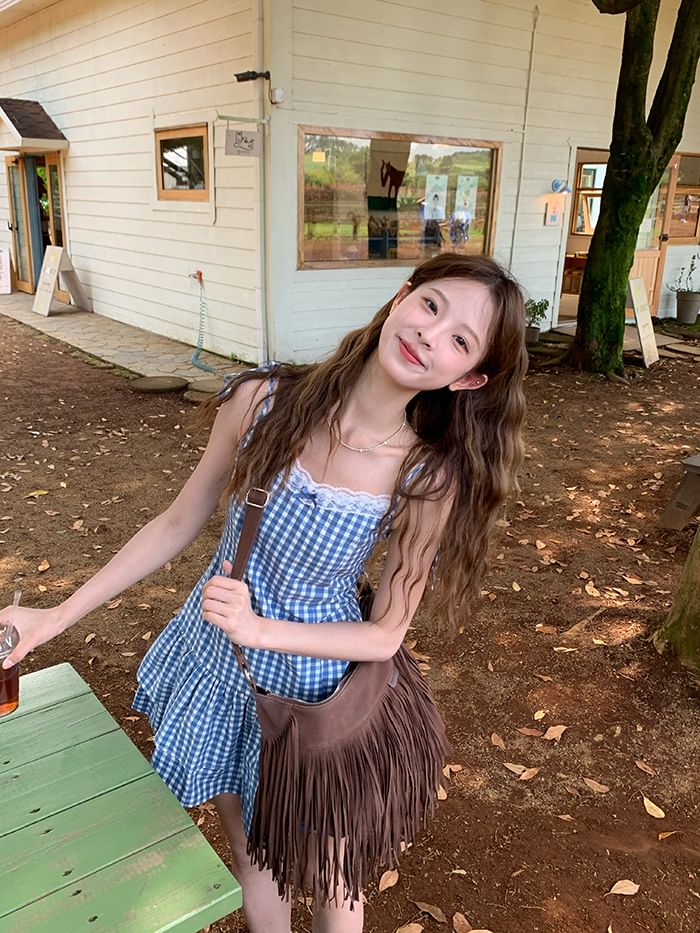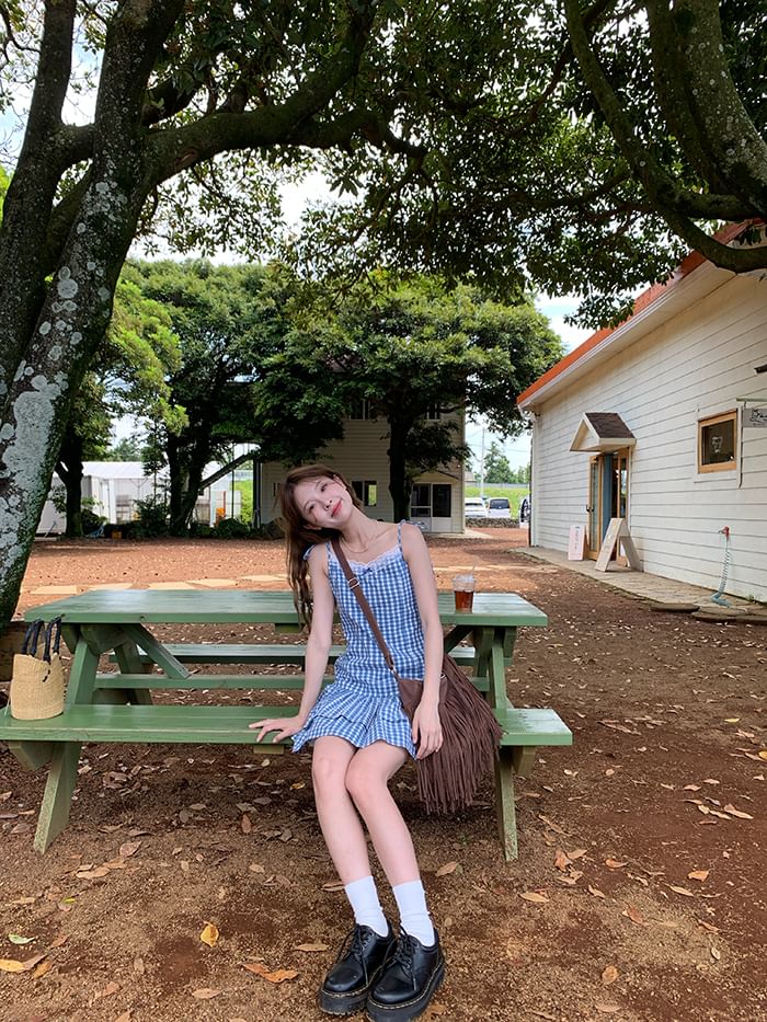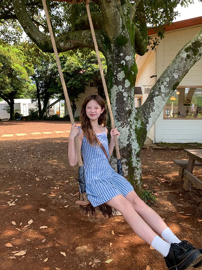 Layered Dress Mini Strap A-Line Spaghetti Trim V-Neck Gingham Lace
