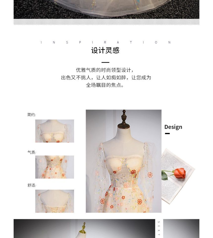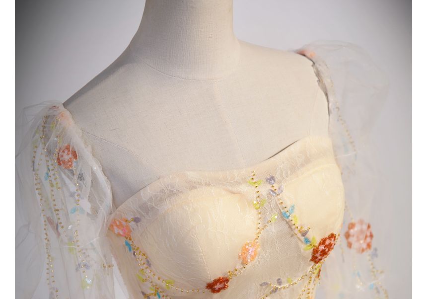 Long-Sleeve Square Neck Floral Patterned Sequin Beaded Mesh A-Line Evening Gown