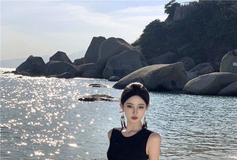Maxi Dress A-Line Two Sleeveless Tone Crewneck