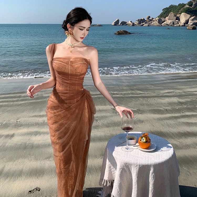 Maxi Evening Sheer Sequin Shoulder One Gown Sleeveless Ruffle