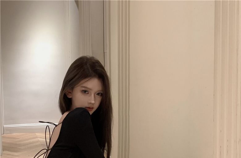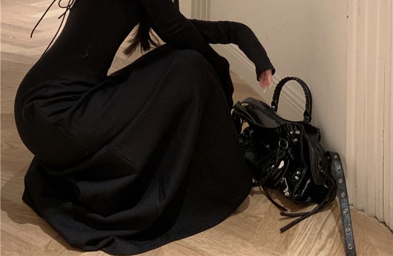 Long-Sleeve Round Neck Plain Open Back Maxi A-Line Dress