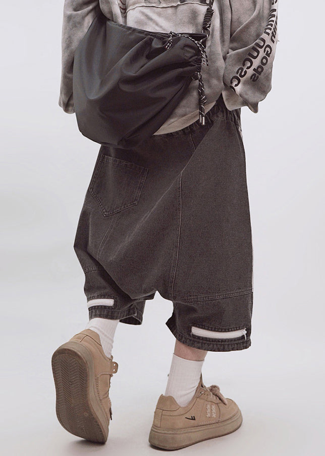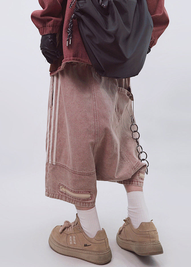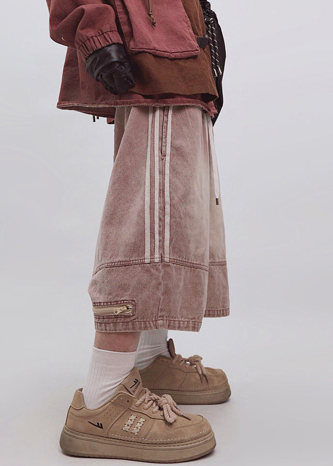 Plus Size Dark Gray Striped Zippered Elastic Waist Men Shorts Summer