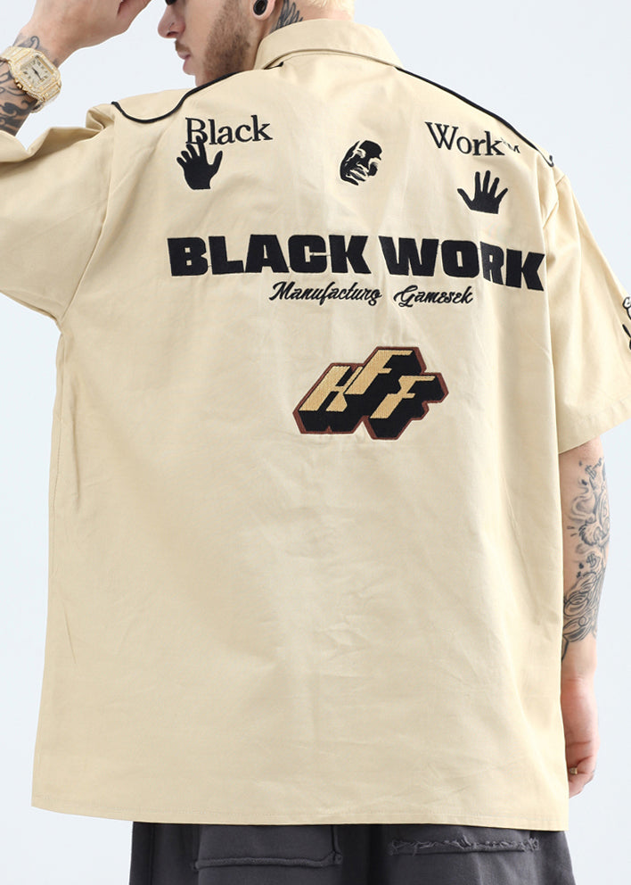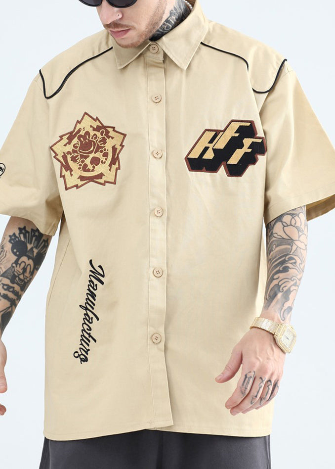 French Yellow Peter Pan Collar Print Cotton Mens Shirts Summer