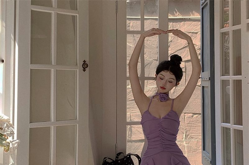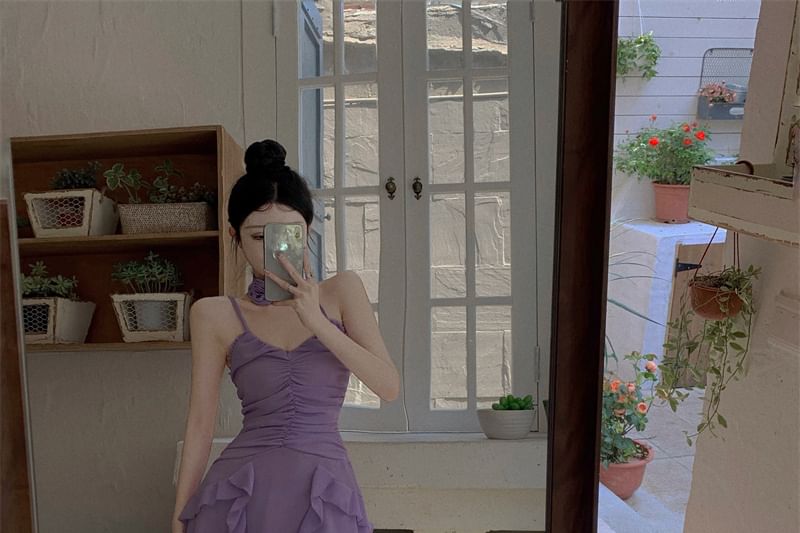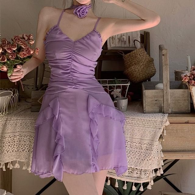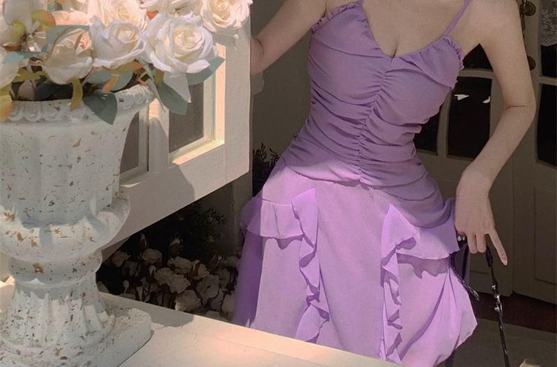 Spaghetti Strap Plain Ruffle Ruched Mini A-Line Dress