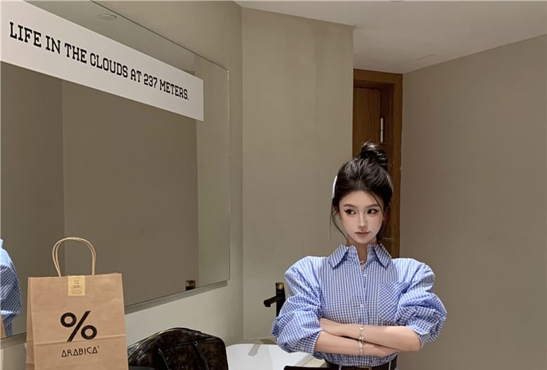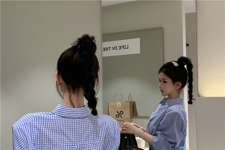 Long-Sleeve Henley Plaid Pocket Front Pleated Hem Mini Shirt Dress