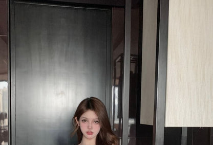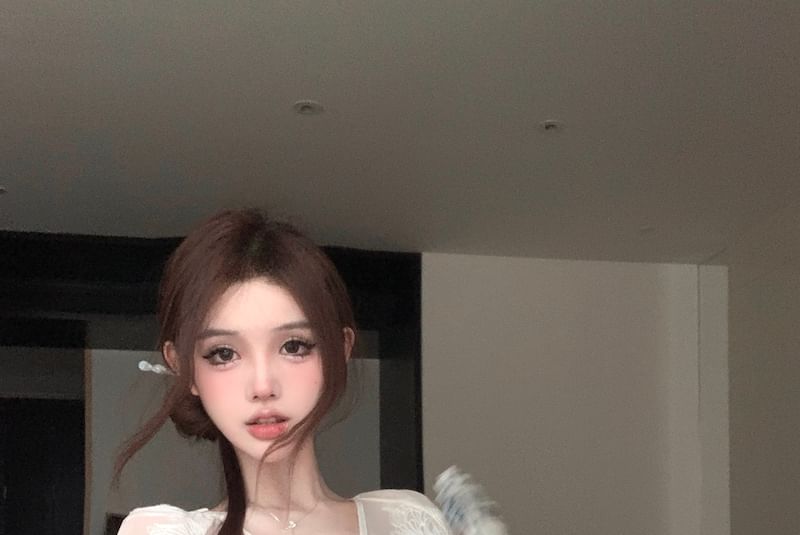 Plain Set Puff-Sleeve Embroidered / High Camisole Skirt Shorts V-Neck Rise Blouse Flower Top Maxi A-Line