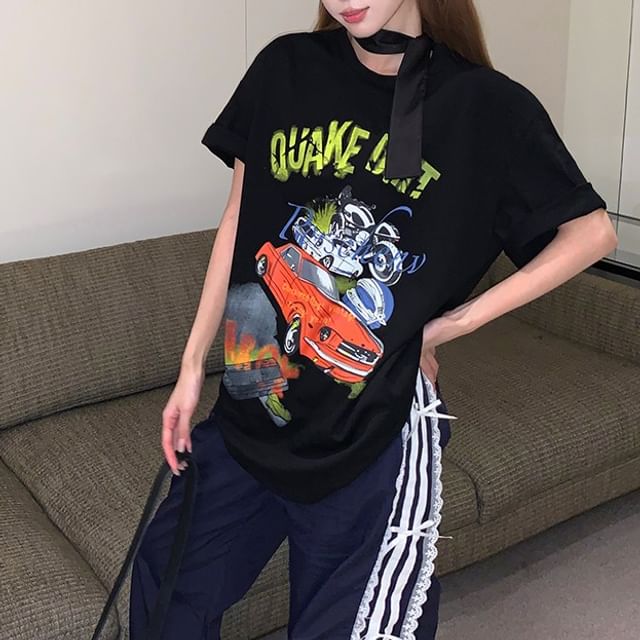 Short-Sleeve Round Neck Graphic Print Tee / Spaghetti Strap Mini Bodycon Dress