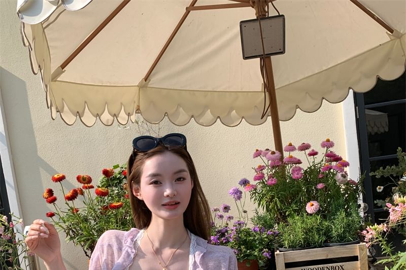 Spaghetti Strap Bow Ruched Lace Panel Mini A-Line Dress / Melange Ruffle Trim Cardigan