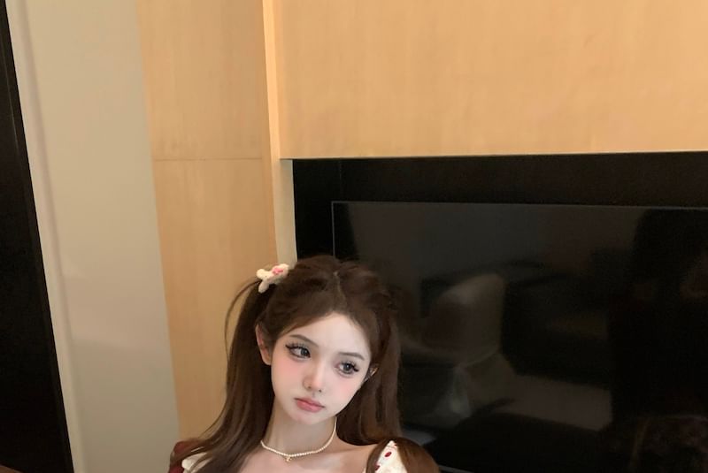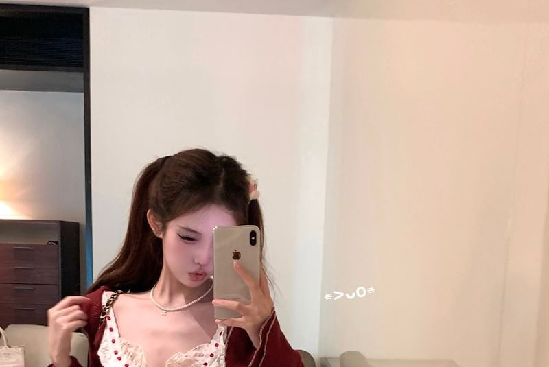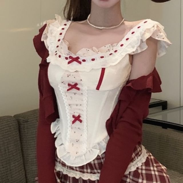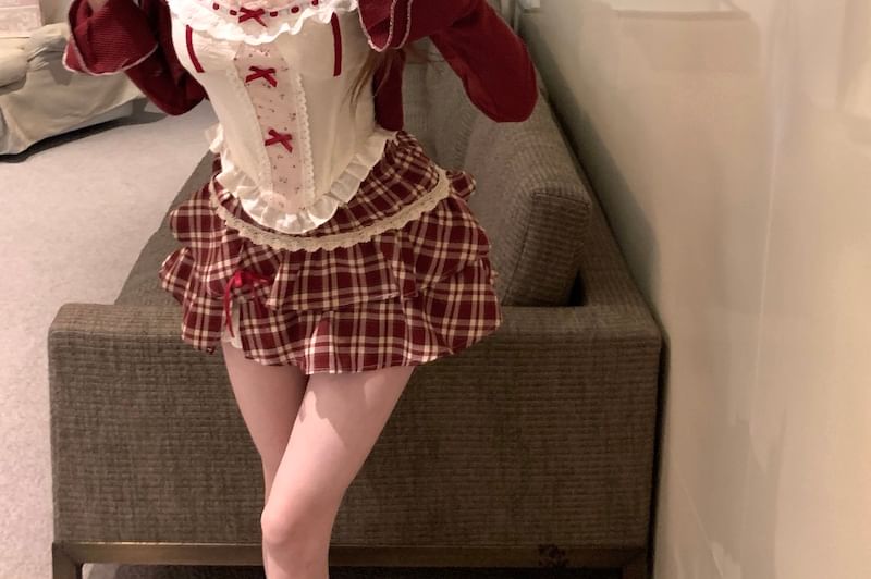 Ruffle Panel Top Floral Print High Cardigan Bow Sleeveless Striped Mini A-Line Skirt Waist Plaid /