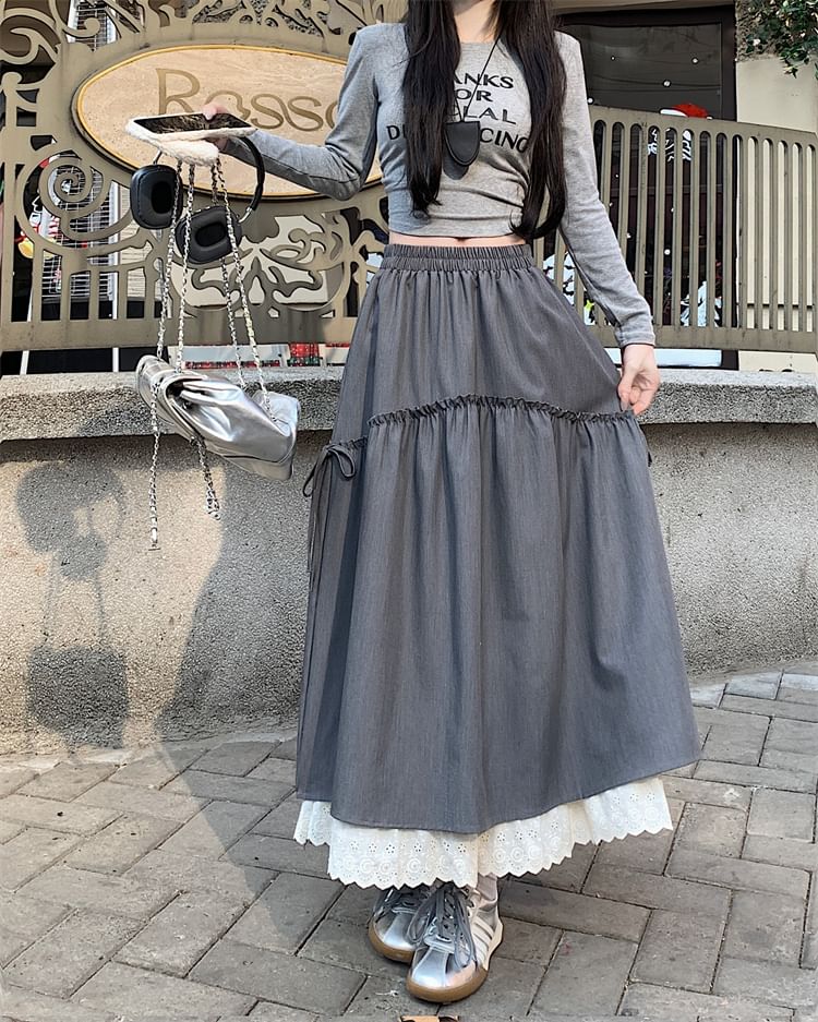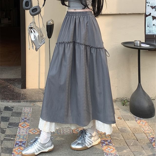 High Rise Plain Lace Trim Maxi A-Line Skirt