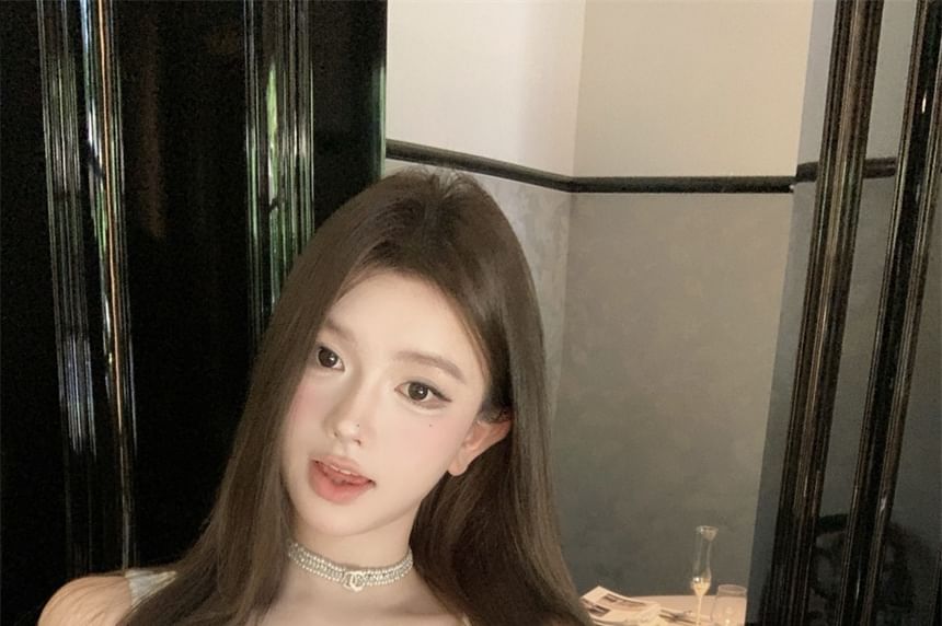 Sleeveless Mini Neck Waist Pencil High Tweed Skirt Scoop Set: Faux Beaded + Crop Top Pearl Button