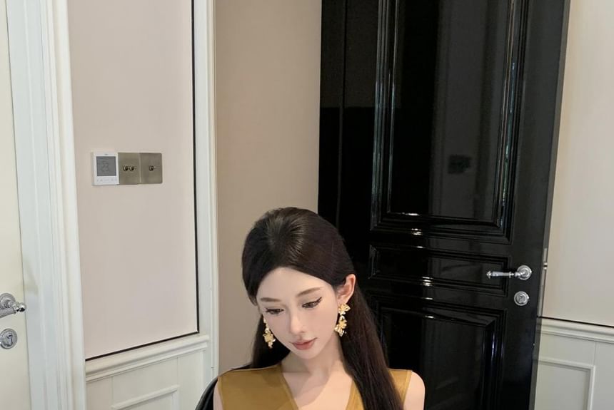 Sleeveless V-Neck Plain Ruched Slit Maxi Sheath Wrap Dress