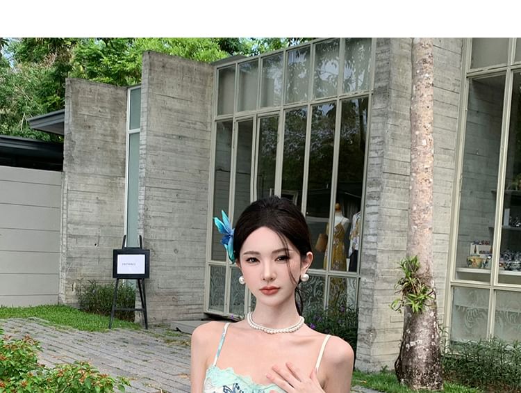 Spaghetti Strap Lace Trim Floral Bodycon Midi Dress