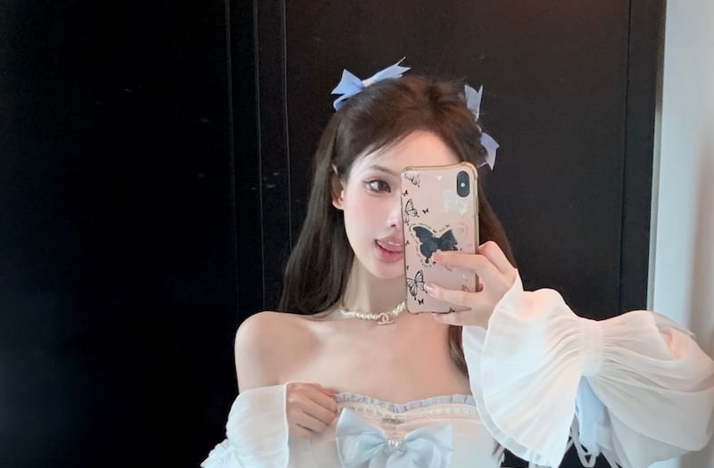 Puff-Sleeve Off-Shoulder Two Tone Lace Trim Mini A-Line Dress / Patterned Lace-Up Corset Belt