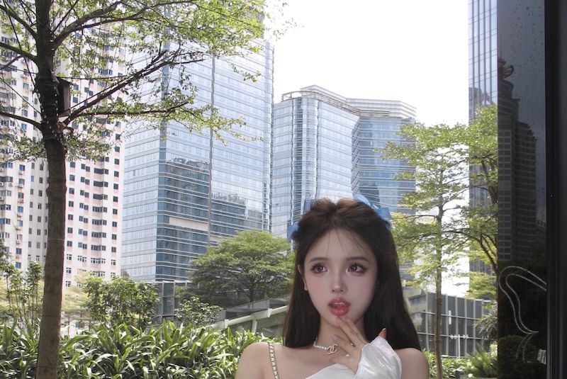 Tone Dress A-Line Trim Two Patterned Lace-Up Off-Shoulder Mini Belt / Puff-Sleeve Corset Lace