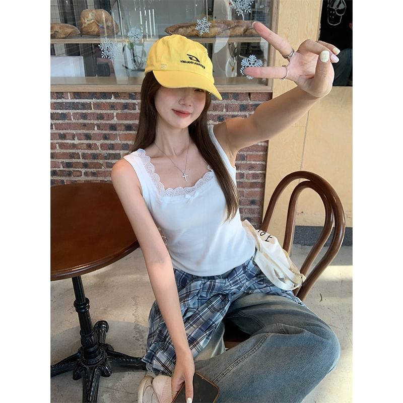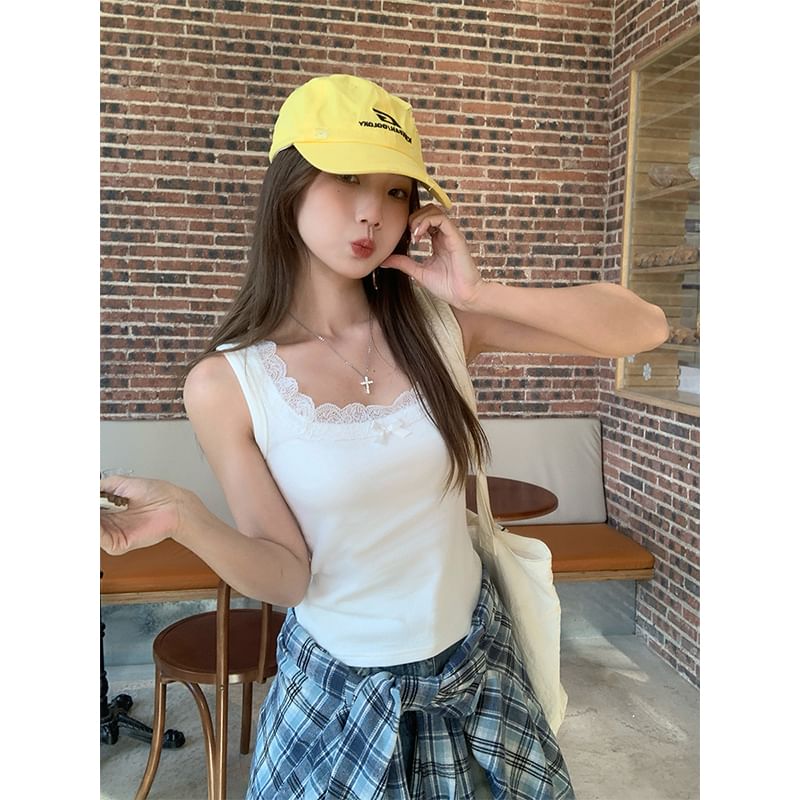 Trim Neck Square Top Tank Bow Slim Lace Plain Fit