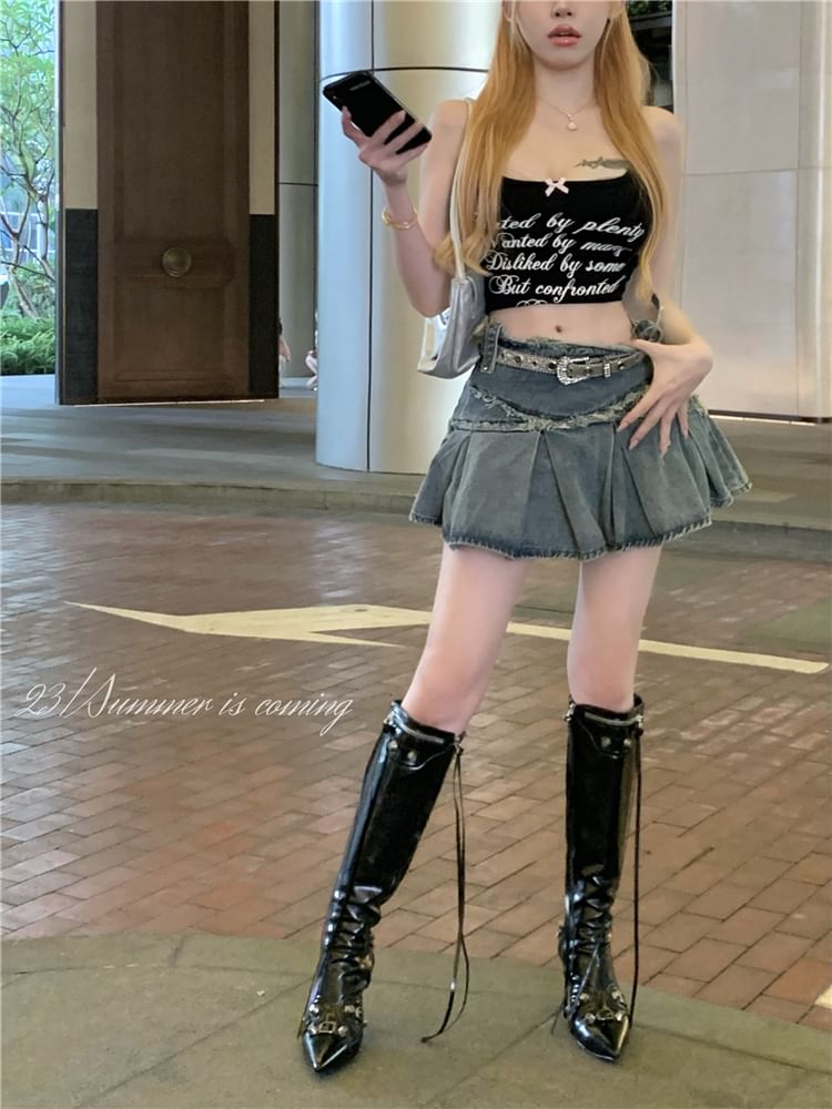 Mid Rise Washed Tassel Trim Mini A-Line Denim Skirt