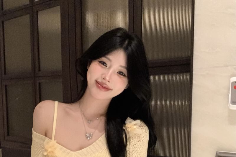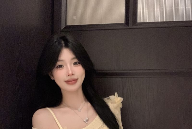 V Knit Long-Sleeve Flower Slip Sheath Mini Accent / Dress Neck